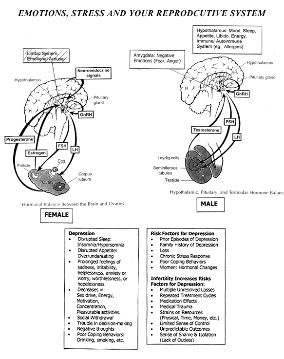 An often cited study by the Harvard School of Mind/Body Medicine showed that women in infertility treatment for an average of two years have depression levels equal to patients with chronic or terminal illness, such as cardiac disease or cancer. Depression affects the same centers in the brain (the hypothalamus and pituitary gland) that control our reproductive hormones. Studies also show that when depression is effectively treated with either a support group or mind/body group, conception rates more than double. These results surprised some doctors who assumed that infertility medications alone were sufficient to produce positive outcomes.